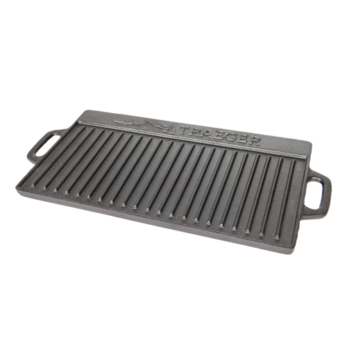 Use the flat side of the Traeger Reversible Cast Iron Griddle to cook food like eggs and pancakes, then flip it over to the ribbed side for searing steaks, burgers, and more.
