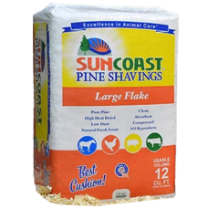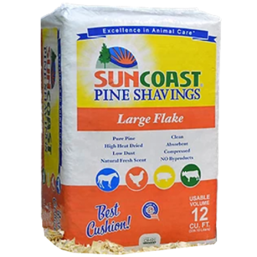 SUNCOAST Pine Shavings Products include our original Large flake which is available in 10 or 12 cubic feet expanded bales. You might also like our Mini Flake which is available in 8 cubic feet expanded. Both products are premium quality pure pine flake for great absorbency.