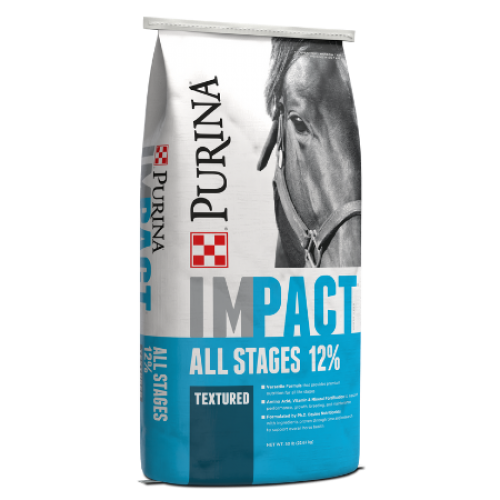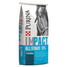 Simplify your feeding program for all your horses with Purina Impact 12% All Stages Textured. Formulated with premium nutrition and a versatile formula that performs for horses of all ages and activity levels.