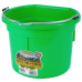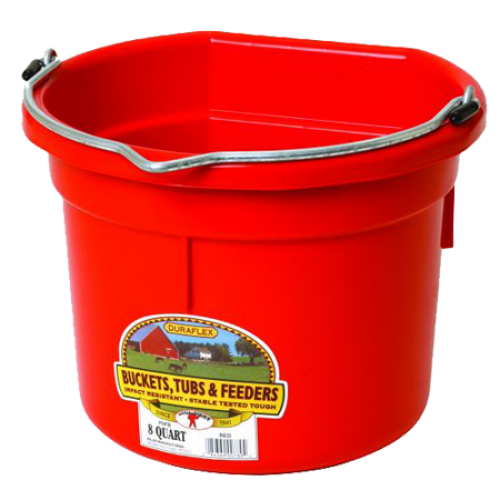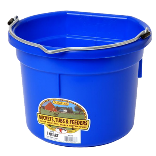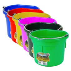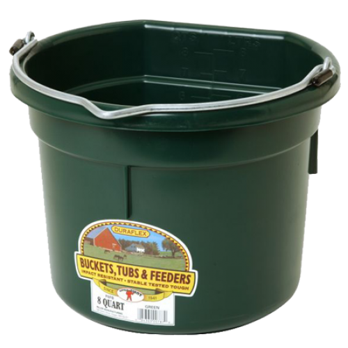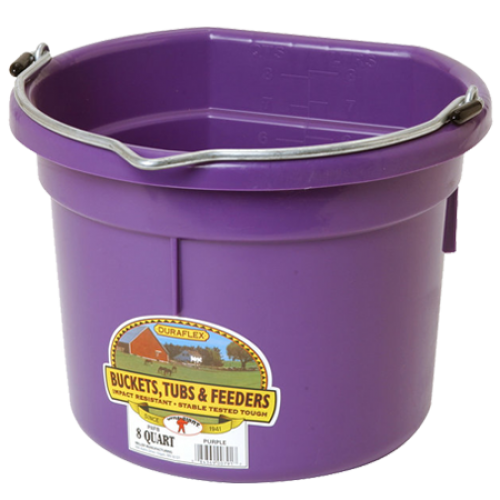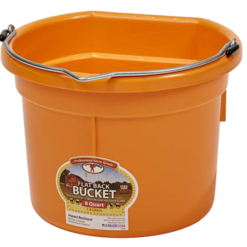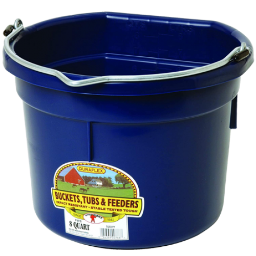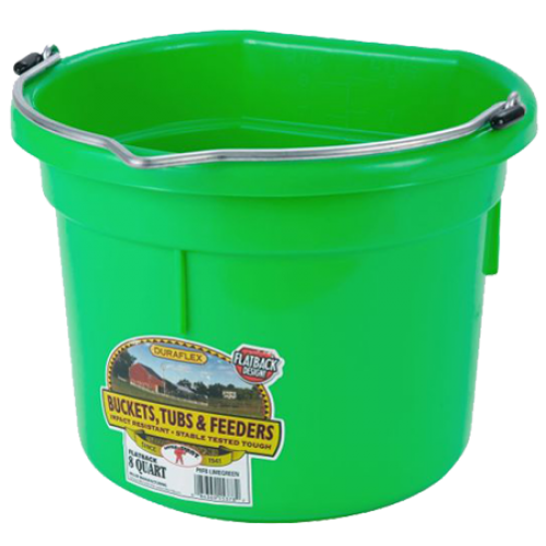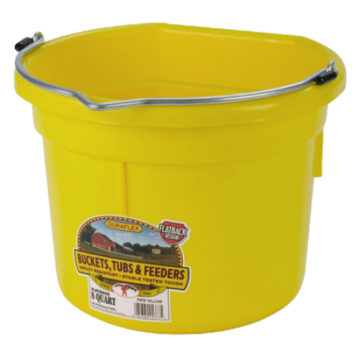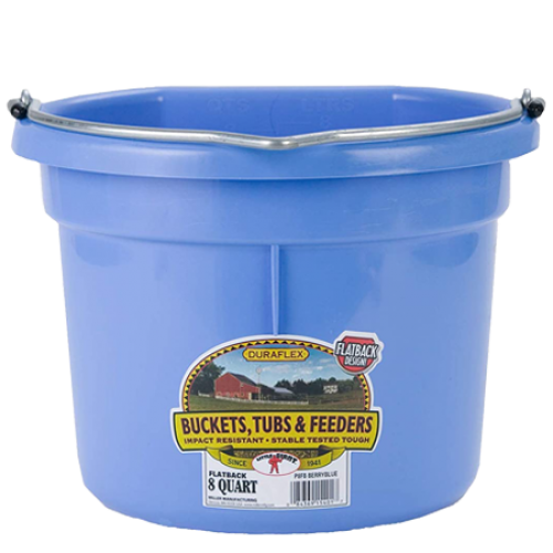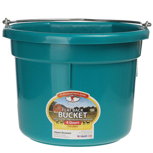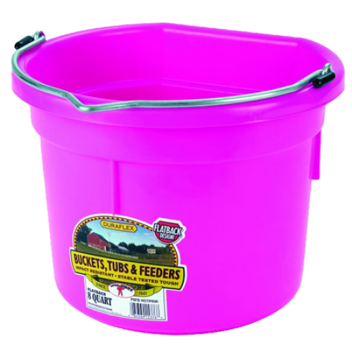 Little Giant Flat-Back buckets are a favorite on farms and ranches everywhere. The Flat-Back fits more compactly for hanging against a wall or fence, plus it makes hauling heavy loads a lot easier. Our buckets are made from polyethylene resin that is impact resistant, protects against warpage, and helps prevent stress cracks. This bucket features a heavy-duty wire bail with notch for hanging, and stacking ribs so the pails come part easier when stacked. 11.5 inch long by 12 inch wide by 9 inch high, holds 8 quarts (2 gallons).