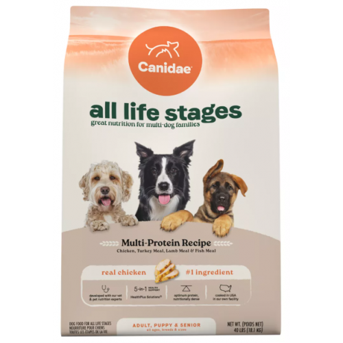 Canidae All Stages Dog Food Formula is new and improved for palatability, digestibility and nutritional benefits. Our all natural dog food formula is made with four human grade meat meals: chicken, turkey, lamb and fish meal. Now with more meat! Also, this high quality food contains skin and coat conditioners to maintain a healthy, luxurious coat.