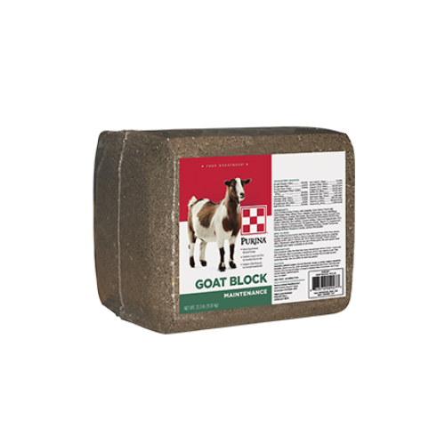 Formulated to supplement goats on range or pasture. An 18%- protein highly fortified supplemental feed designed to enhance a goat's diet on native range or pasture. Purina Goat Block contains the essential vitamins and minerals needed to meet a goat's nutritional requirements. Added protein helps support muscle growth in kids and milk production in lactating goats.