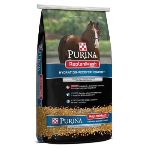 Purina RepleniMash™ Product is nutritionally balanced and made with wholesome ingredients your horse is accustomed to, plus a whole lot more. With Outlast® Gastric Support Supplement and a science-backed serving of electrolytes built-in, this tasty mash can help your performance horse feel his best or simply let your friend know you care.
