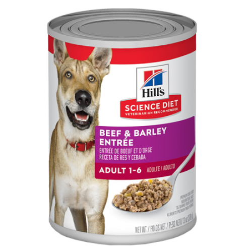 Hill's Science Diet Adult Beef & Barley Entree Canned Dog Food has precisely balanced nutrition to maintain advanced fitness. This delicious formula contains high-quality protein for lean muscle, promotes ideal body weight, and is easy to digest.