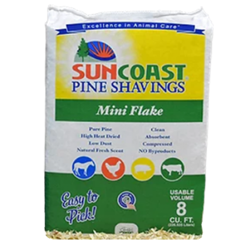 Suncoast Mini Flake Bedding is a premium quality pure pine mini size flake for great absorbency. The smaller cut flake is easy to sift, reducing stall maintenance time. You'll love the fresh pine scent. Each bag is 8 cubic feet of usable flakes.