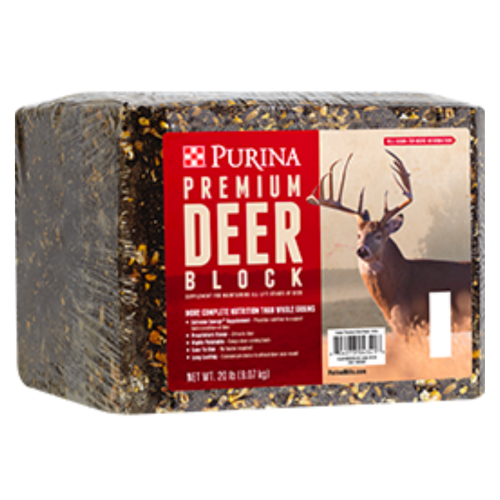 Feed New and improved Purina Premium Deer Block free-choice with access to adequate native forage or good quality hay. Place the block in areas frequented by animals, taking care not to touch the block as the wrapper is being removed. When placing the block out for the first time, place small amounts of corn, apples or carrots around the block to attract deer. Place close to a constant supply of fresh, clean water. Consumption will vary with deer density, season and availability of native forage.